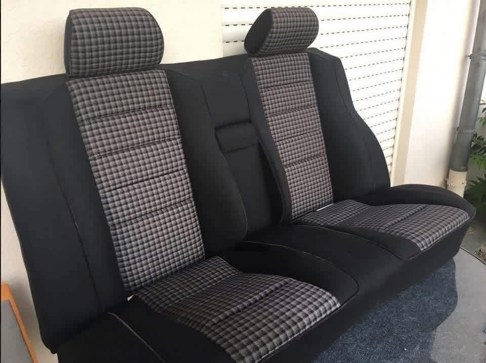 ensemble complet de sièges sport Sportline Check noir pour Mercedes W201 190E, comprenant sièges avant et banquette arrière fendue assortie.